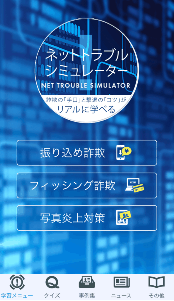 ネットや電話のトラブルを疑似体験できるアプリの企画で、詐欺被害、ウィルス感染、SNSトラブルなどを体験でき、携帯電話初心者や子供にトラブルの怖さを教えることを目的としたスマホ用アプリになります。
